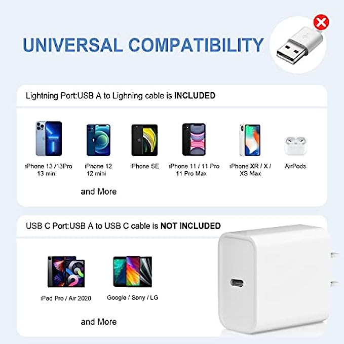 • 【Universal Compatibility】Wall charger works efficiently with USB-C cords (not included),compatible with iPhone13/13 Mini/13 Pro/13Pro Max/iPhone12/12 Mini/12 Pro/12Pro Max/11/11 Pro/XS/XS Max/XR/X, mini/Air/Pro,Galaxy/S20/S10/S9, Note 20/10/9, etc.
