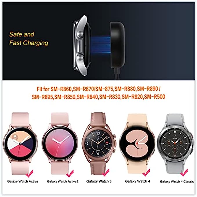 • COMPATIBILITY:This Galaxy watch charger is specially designed for Samsung Galaxy Watch 4 40mm 44mm/4 Classic 42mm 46mm,Galaxy Watch 3 41mm/45mm(Not for gear S3),Active 2 40mm 44mm,Active 40mm.Includes SM-R860/R870/880/890, SM-R840/SM-R850/SM-R8450,SM-R820/R830/R8350,SM-R500.