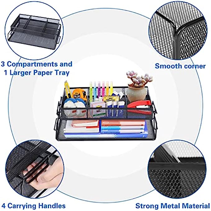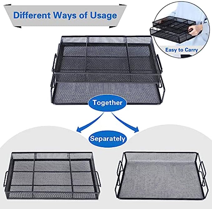 【Lightweigt and Sturdy Stylish Material】- Our great desk organizers and storage are made of solid mesh metal, combining upgraded barbed wire and wire craftsmanship, adopting electroplating technology, not easy to bend and wear, long lasting and does not fade. Smooth metal rims and ABS coating of file organizer for desk feels great to the touch. Mysterious and noble gold black, is suitable to match with other colors