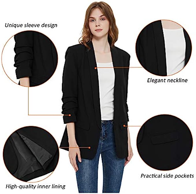 Charis Allure Womens 3/4 Ruched Sleeve Blazer Jacket Lightweight Work Office Open Front Solid Coat, Black