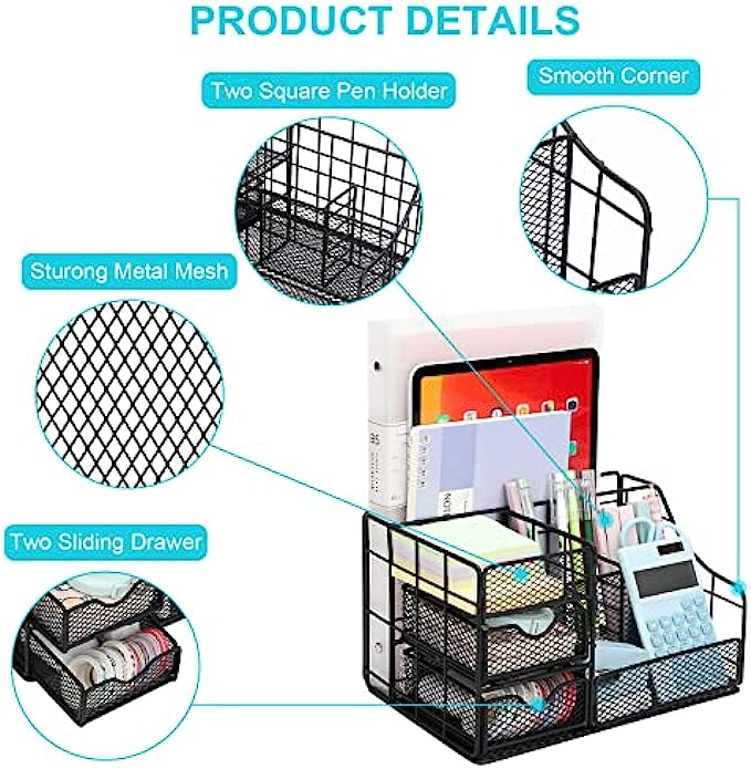 【Space saving modern design】Mesh design allows you to easily find anything you need. Our desktop organizer has unique 2 sliding drawers, Perfect for storing your office gadgets such as sticky notes, rulers, business cards, small tapes,small clips, etc. Let you stay away from messy desktop and keep organized.