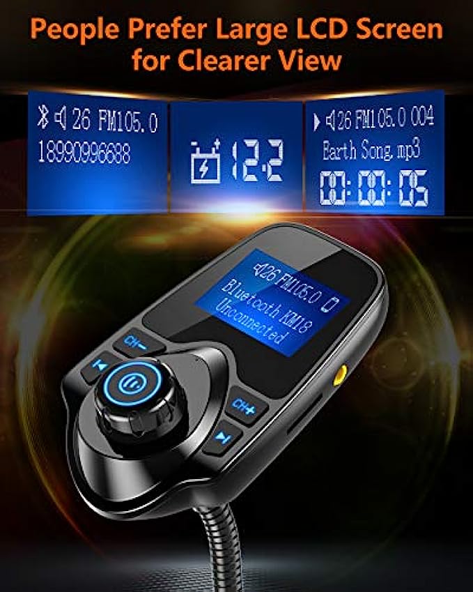 1.44 Inch LCD Display: Nulaxy KM18 Bluetooth FM transmitter has a 1.44 inch screen for better displaying information like phone calls, FM channels, music, car battery voltage, etc. The ideal screen size to assist you in driving safe without disturbance. Flexible Gooseneck&Bluetooth V5.0: The rotatable Gooseneck of the wireless radio adapter can provide you with an adjustable viewing angle and optimal viewing comfort of LCD display screen. With the Bluetooth V5.0 technology, the car bluetooth adapter can provide a more stable and faster connecting without intermittent disconnection. Noise Cancellation&Hi-Fi Sound Quality: Nulaxy noise-cancellation technology dampens the road noise and gives you clear, crisp sound for hands free calls. High Quality Music Streaming ensures crystal clear sound for listening music and hands-free calls. Hands-free Calls: All in one button for hands-free calls: answer/reject/hand up/recall make you seamlessly switch between incoming calls and music. Enjoy complete voice-control and safer driving with this Bluetooth transmitter. Wide Compatibility: The fm transmitter bluetooth for car is compatible with most devices on the market, such as iPad, iPhone, iPod, HTC, Galaxy, Sony, MP3 player, tablet and Android Smartphones. You can play your favorite songs on your car stereo via Bluetooth, TF Card and Aux Cable. And it fits 12V-24V cars and trucks.