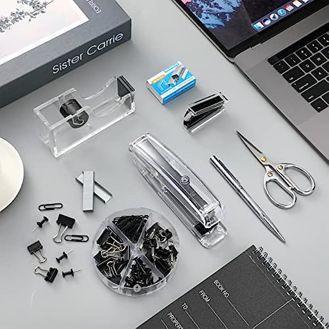 Quality materials: the stapler, tape dispenser and stapler remover are mainly made of acrylic and metal, clear and bright; Touch smooth and comfortable, not easy to break, durable, elegant and beautiful, very suitable for desktop office supplies