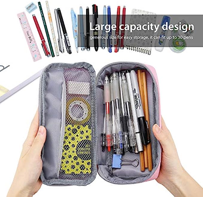 Pencil bag dimensions: 8.0"×3.7"×2.0" inches, generous size for easy storage, it can fit up to 30 pens and pencils as well as erasers, calculator, mini stapler, sticky tape and other school supplies perfectly The interior mesh pocket provides roomy space for keeping small notes, cards, tickets, erasers and paper clips safely in one place; User-friendly design allows easy identification for all your little stuff Durable and water-resistant material keeps your stationeries well-protected and prevents them from dust, scratches and bumps, easy to clean; Double smooth zippers offer quick access to items inside Lightweight and compact, convenient to put in the backpacks or purses when heading for school or office, no more digging up in your bag Multifunctional case could serve multiple purposes, it can be even used as a travel case, makeup bag, keys bag, coins pouch, cellphone pouch and more to fits all your basic daily needs