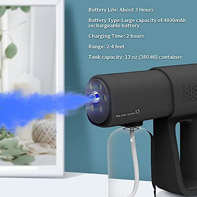 【Handheld Wireless Fogger】You can easily clean full rooms in under 5 minutes. More effective than manual hand wiping, pump spraying or mopping. The spraying range is about 2-4 feet. Nano sprayer gun can be sprayed directly on the surface of the human body, fabrics, home appliances and other objects.