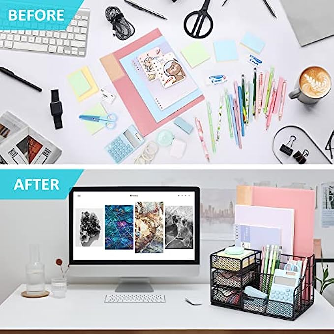【Space saving modern design】Mesh design allows you to easily find anything you need. Our desktop organizer has unique 2 sliding drawers, Perfect for storing your office gadgets such as sticky notes, rulers, business cards, small tapes,small clips, etc. Let you stay away from messy desktop and keep organized.