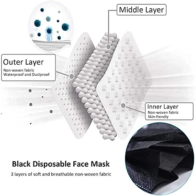 • Black Disposable Face Masks - Masks are made from 3 layers of soft and breathable non-woven fabric. These disposable face masks feature a pleated, expandable design for a comfortable and lightweight fit.