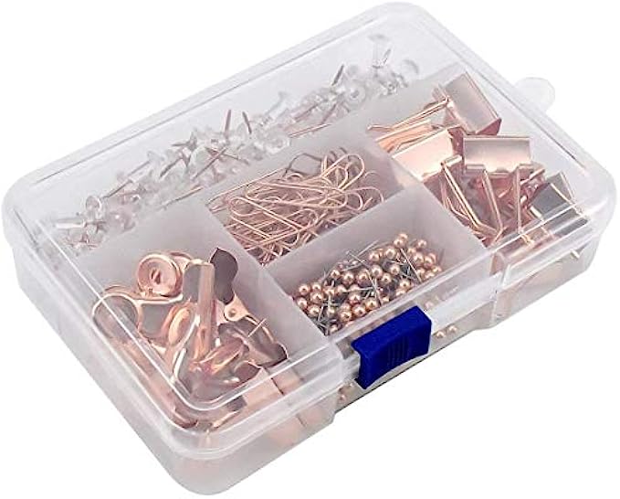 HQDeal 500PCS Rose Gold Office Stationery Set, 100Pcs Push Pins+80Pcs Paper Clips+300Pcs Round Head Pins+14Pcs Binder Clips+6Pcs Bulldog Clips with Push Pins Clips for Home School Office Supplies