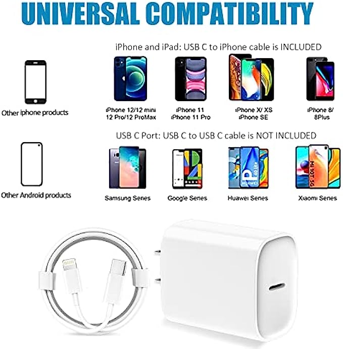 【3X Fast Charger iPhone】20W USB C iPhone fast charger with 10ft USB C to lightning cord, PD 3.0 quickly charge USB C port provides 3x faster charging speed than original 5W iphone chargers do. It can charge iPhone 13, iPhone 12 up to 50% in just 30 minutes which saves more time for you.