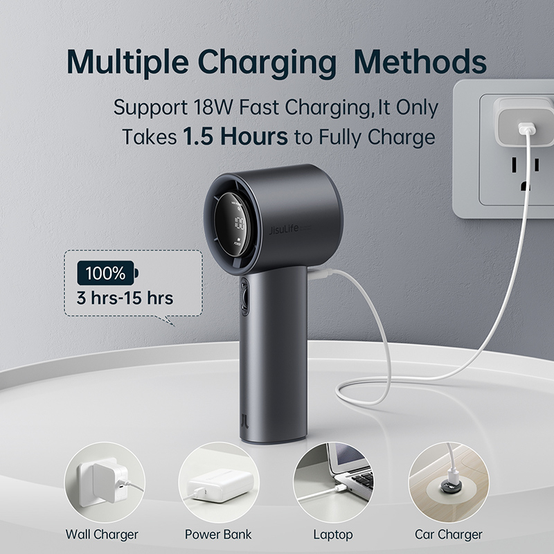 JISULIFE Portable Handheld Fan100 Gear Strong Wind Speed Metal Body Digital Display Adjustable