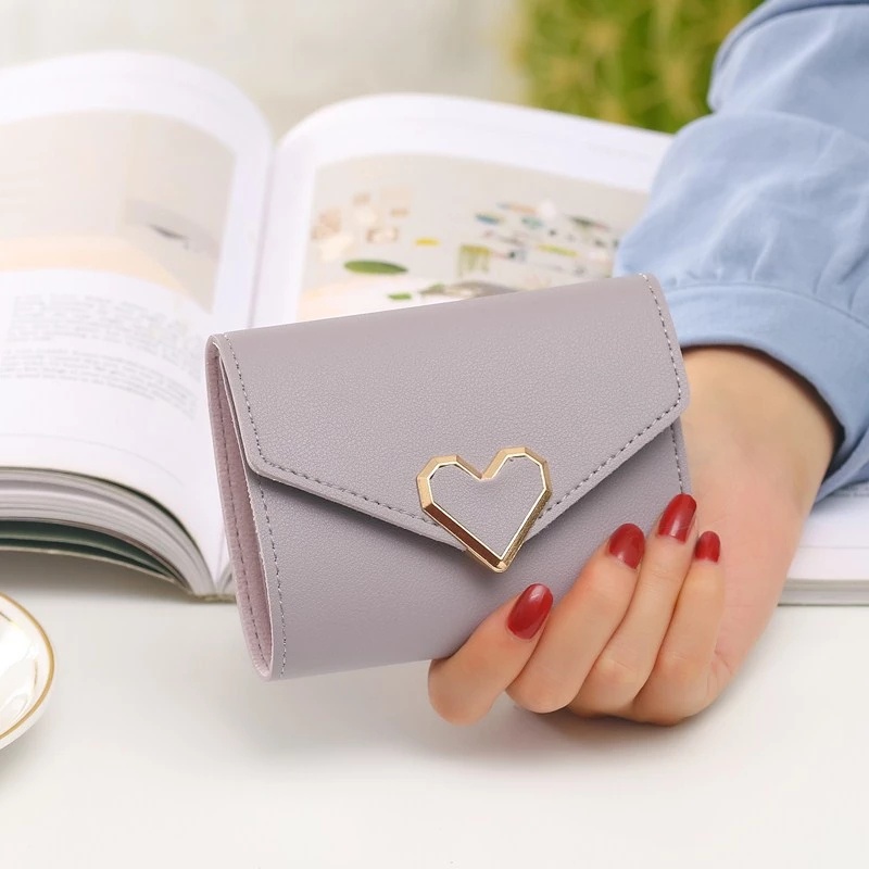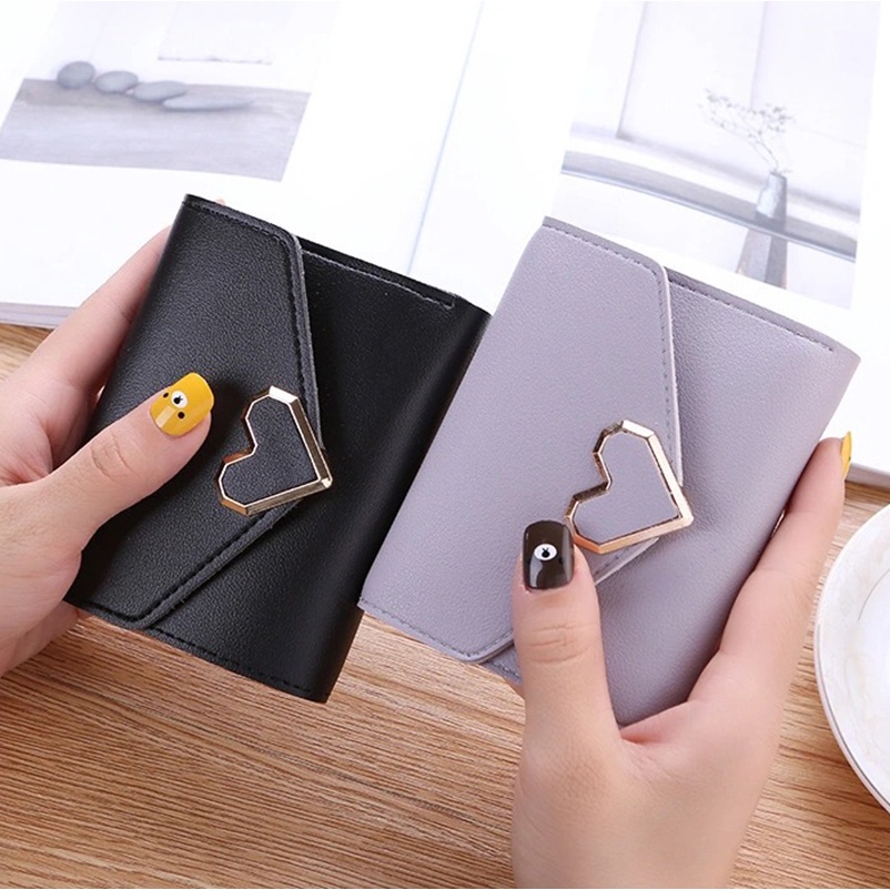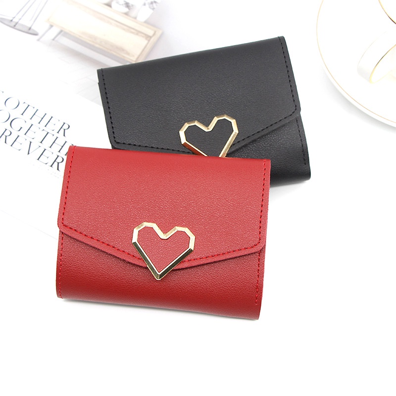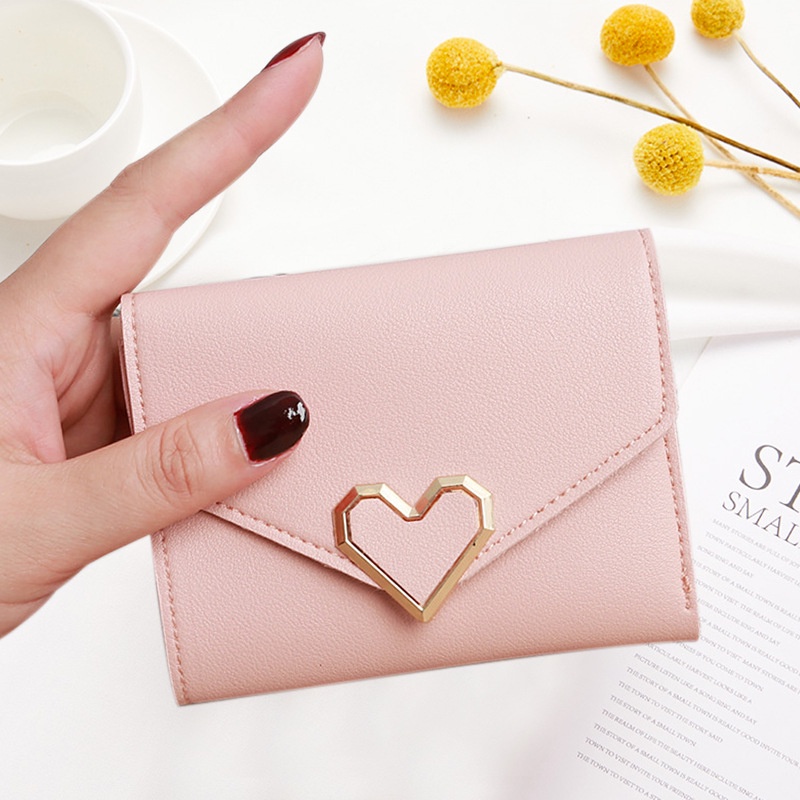 Korean Style Women's Short Wallet PU Leather Wallet Fashion PU Small Wallet Portable Women's Simple Wallet Cute Heart Folding Wallet With Metal Buckle Premium Tri-fold Clutch