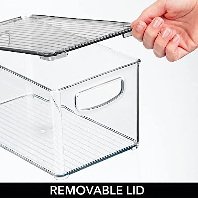 PORTABLE & LID: Create space-saving storage in closets, shelves, cabinets, cupboards or on your work surface; Portable to move from room-to-room; Clear view so you can easily find what you are looking for without opening the bins; Keep items contained, organized and dust-free; Perfect for storing extra office supplies like staples, highlighters, paper clips, binder clips, staplers, notepads, sticky notes, washi tape, glue sticks, rubber cement and more; Set of 4
