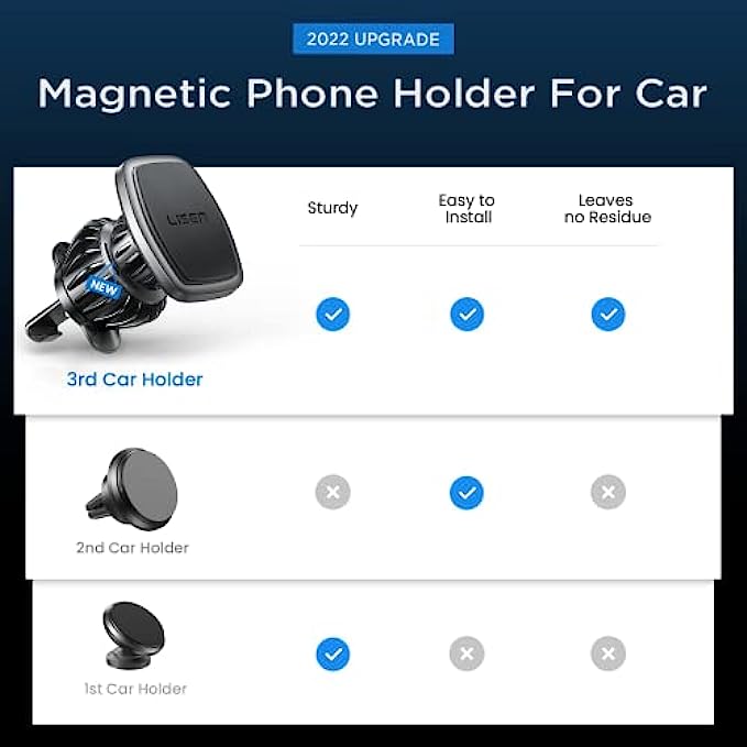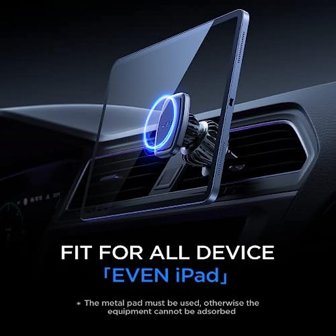 ?UPGRADE HOOK CLIP:The "hook shape" of this car phone holder mount creates "three gripping places" that firmly grasp the air outlet blades. Even when driving on uneven roads, it won't come off. The car mobile phone holder was created for innovation and usefulness, and it addresses the market's common issue of easy slipping off. LOCK YOUR PHONE FIRMLY: LISEN Magnetic Phone Car Mount with 6 built-in strong magnets, the maximum bearing up to weight of 4 cellphones. Powerful suction keep your cellphone stay stably even when drive on a bumpy road. PLEASE NOTE:1. It is recommend that use the “square pad” on the back of your phone/case. It is more stable than the round. 2. ANY DEVICE NEEDS TO USE THE METAL PALTE EVEN iPhone 12 and iPhone13. EASY TO INSTALL: Due to the unique hook clip design, this iphone car mount is incredibly simple to install. Simply place it on the air outlet blade of the car and flip the knob to change the clip's length to fit the socket. The installation is completed. ? CONVINCING QUALITY & UNIVERSAL COMPATIBILITY: LISEN car phone holder won SGS RoHS & SGS CP65 official certification and passed the magnetic force, telephone signal, hook stability and ingredient safety test. Quality is strictly controlled. The car holder holds most smartphones and mini tablets compatible with iPhone 13 12 11 pro max / XR / X / 8/7/6/5, Note 9 / Galaxy Note20 U, S21 S20 S10 S9 S8 S7 S6, iPad Air 2 / Mini 3 / Pro 9.7 and more.This product cannot work with MagSafe. ?OFFICIAL CERTIFIED& WIDELY COMPATIBLE: LISEN Car Phone Holder is officially certified by SGS RoHS and SGS CP65, and has passed tests for magnetism, phone signal, hook stability and ingredient safety. The quality-controlled car mount is compatible with the following devices: iPhone 13 12 11 pro max / XR / X / 8/7/6/5, Note 9 / Galaxy Note20 U, iPad Air 2 / Mini, and other smart phones and Mini Tablet 3 / Pro 9.7 and above. NOTE:IT CAN’T BE USED WITH MagSafe! ?10X EASIER USING: This magnetic phone holder for cars has no buttons, making it simple to use when compared to the clip phone holder. Magnetic attachment simply place the phone close to the stand base, and it will be rapidly absorbed and securely fastened on the stand with a snap. Even when driving, it may be simply used with one hand. ?WHAT'S YOU GET: 1*LISEN magnetic phone car mount, 2*Round metal Pads, 1*Rectangular metal Pads, 2*Round PE Films, 1*Rectangular PE Film. NOTE:ATTACH THE METAL PLATE BELOW THE WIRELESS CHARING AREA OTHERWISE THE MagSafe WIRELESS CHARGING CAPABILITY WILL NOT WORK!