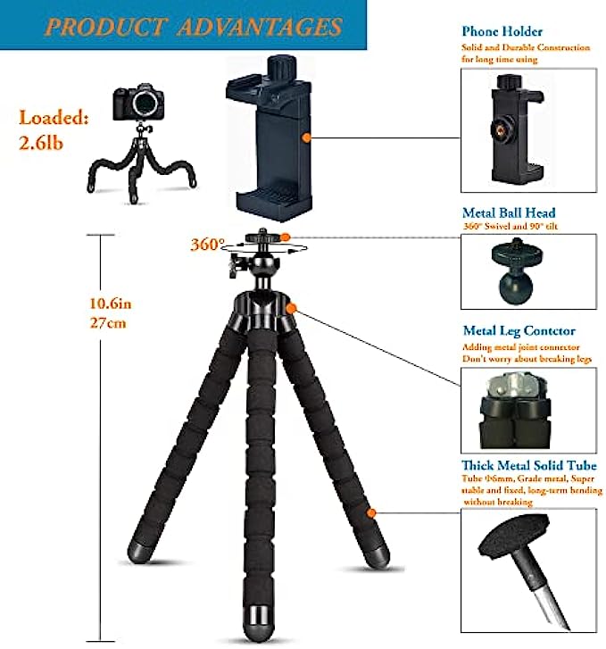 【Strong and Sturdy】 Upgrated Phone tripod loaded up to 1.2kg(2.6lb), use metal ball head, legs are made of thick premium metal and full metal connector, reinforced with a rubber coating and sturdy foam, keep for long tern using without break
