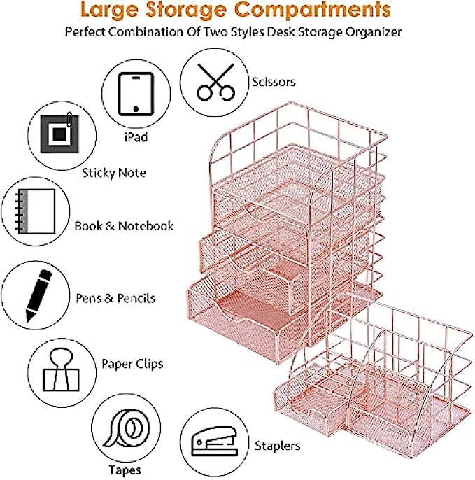 POPRUN Desk Organizer Pen Holder Office Supplies,Cute Mesh Office Supplies Accessories Essentials Caddy with Drawers for Home & Office Desktop Organization & Decor, Rose Gold - Set of 2