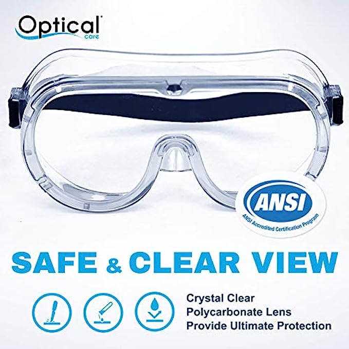 • CRYSTAL CLEAR LENS - Eye protection with a 180 degree field of view, are splash-proof, anti-fog, fits over glasses, and Blocks 99% UV light. Medical Safety goggles provide protection from gasses, chemicals, splashes, droplets, and air-born aerosol particles.