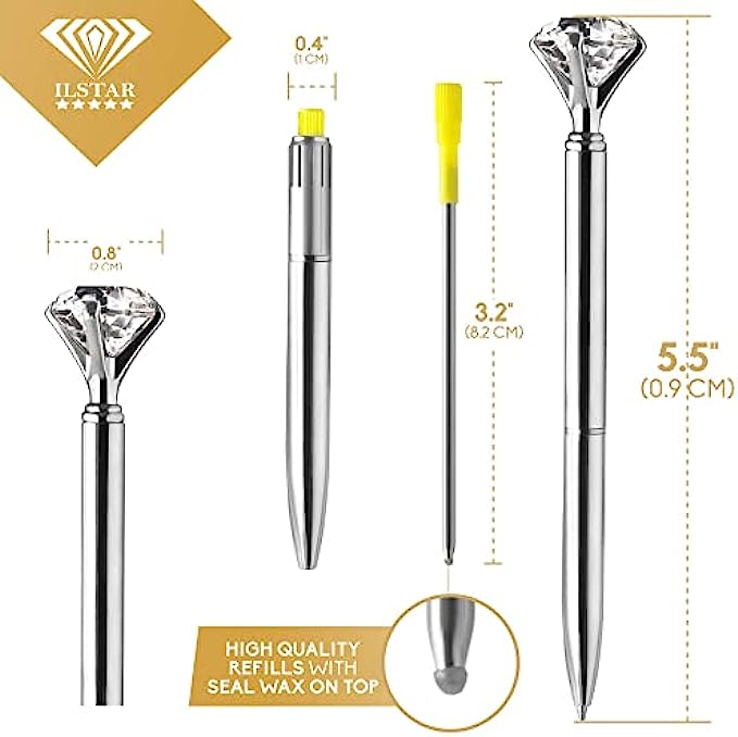 • ? How can I use them? Comfortable and simple to use, with just a twist action to open or close, the pretty pens with fine point and precious stone on top offer smooth and beautiful handwriting. The jeweled refillable bulk pens are perfect for guest book, journal, novelty, business, conference, school, teachers, graduation, anniversary, birthday, wedding planner and photoshoots. Fun Christmas gifts, these bling pens for women are durable and reliable writing instruments that won’t let you down.