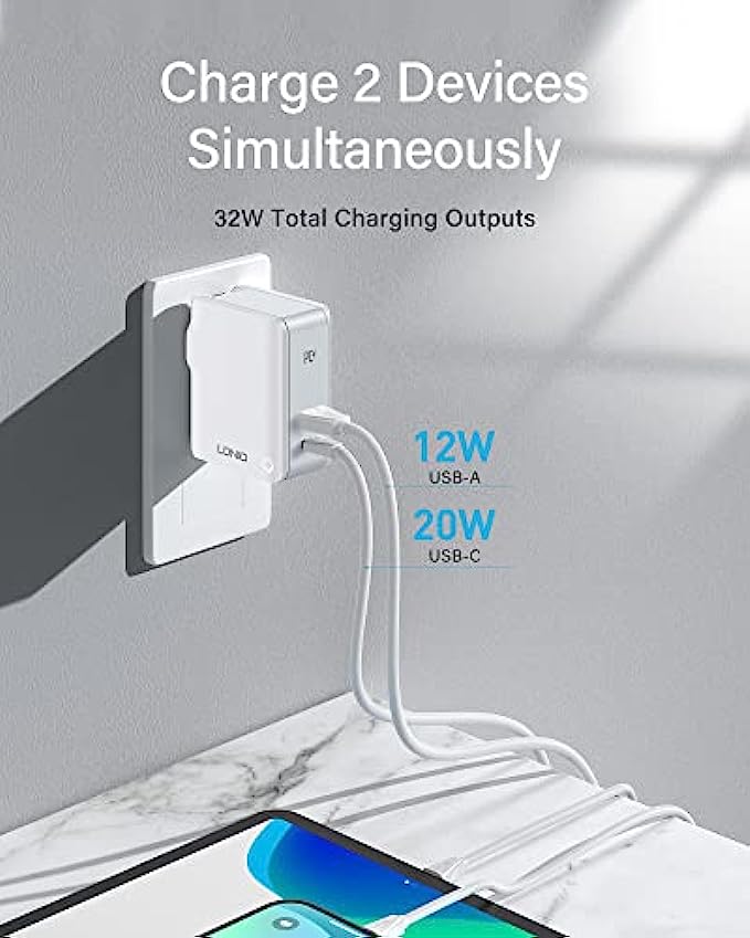 【Charge 2 Devices Simultaneously】This USB C wall charger can deliver up to 32W in total. Get both a USB-C PD port(20W Max) and USB-A port(12W Max), which are designed to fuel both smartphones, tablets, or other accessories simultaneously, and it also helps save precious space in your travel bag.