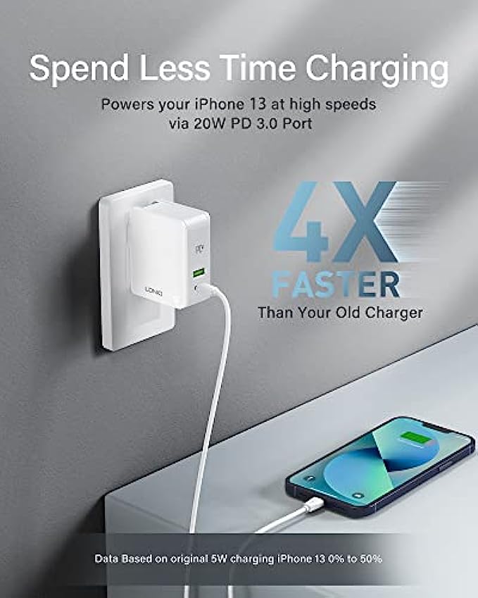 【Spend Less Time Charging】Charger block equipped with Power Delivery Fast Charging, specially designed for iPhone. 20W USB-C port charges iPhone 13 up to 58% in just 30 mins. Compared with an original 5W charger, the charging speed of this USB c charger can reach up to 4X faster.