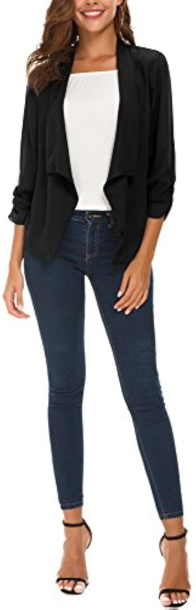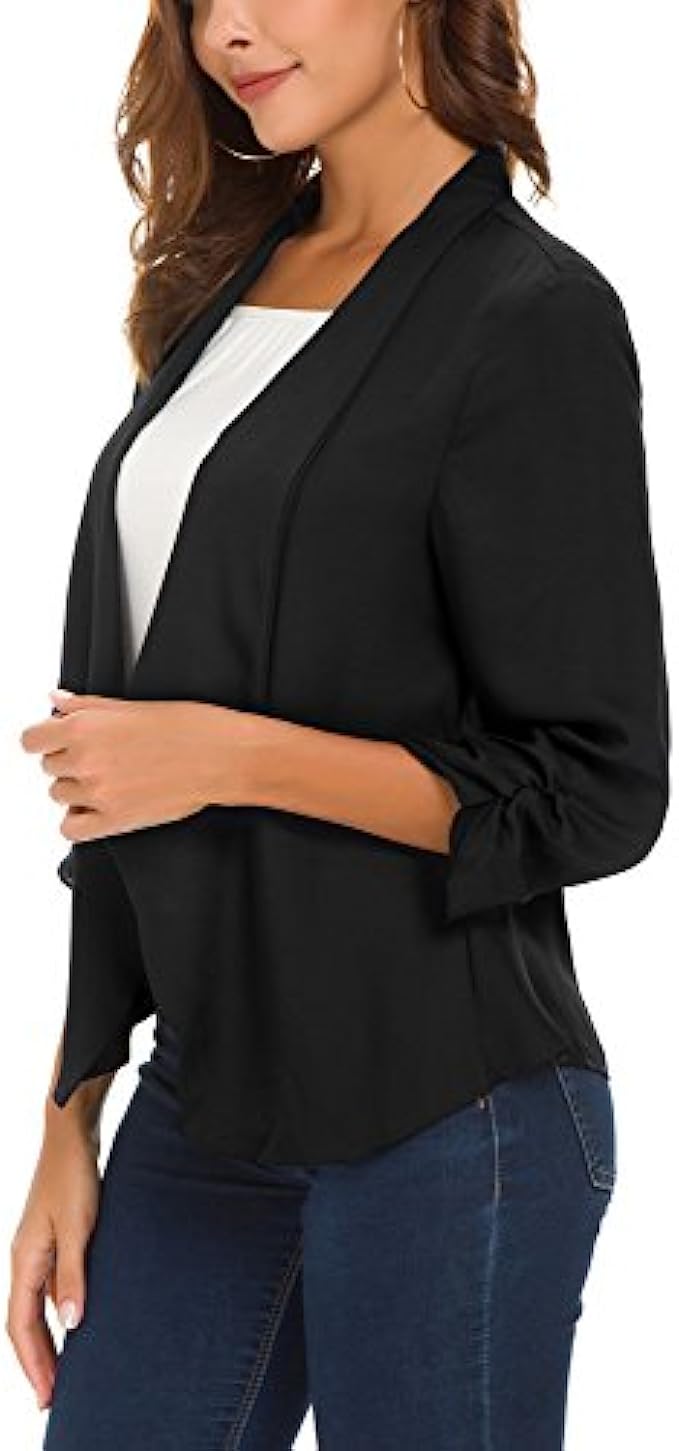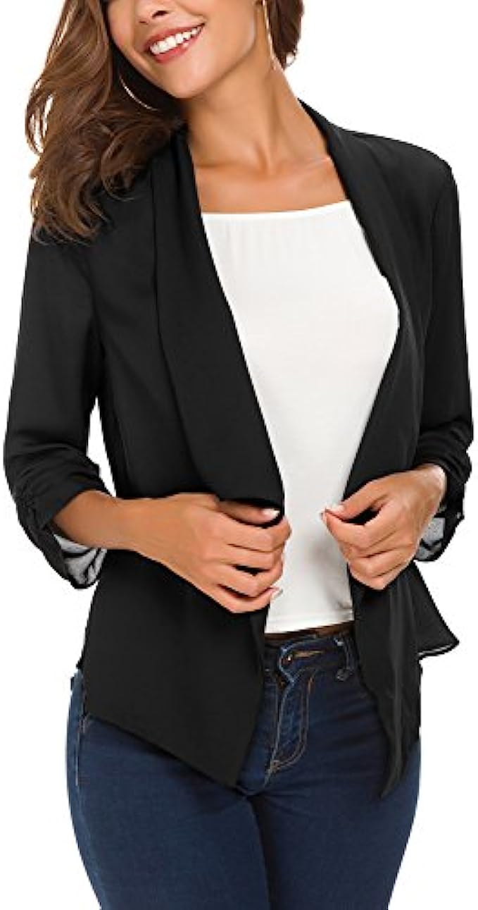 100% Polyester Imported Soft and lightweight fabric which is breathable and comfy and excellent in workmanship,make you feel comfortable for all-day Features 3/4 ruched sleeve blazer, open front, no padded shoulder,uneven vented hem,and notched collar Easy to match clothes,it's super easy to turn any outfit into a classy corporate wear when you have this lightweight chiffon blazer in your closet Great for casual, formal, business wear and other special events. Whether for a casual or a professional look, this blazer jacket makes you cool